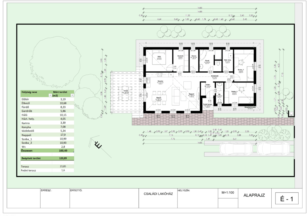 Népszerű típusház, elosztása miatt igen kedveltA gyerekeknek szánt szobák a szülői hálótól kicsit távolabb találhatóak. A Nepál típusház az alábbi helyiségeket tartalmazza:Szoba_1 (10,99 m2)Szoba_2 (10,93 m2)Szoba_3 (10,15 m2)Háztartási helyiség (4,05 m2)Nappali + amerikai konyha + étkező (17,90 m2 + 7,08 m2 + 10,68 m2)Fürdő (8,23 m2)Különálló WC (2,80 m2)Kamra (3,39 m2)Beépített előtér (3,19 m2)Gardrób (5,86 m2) Közlekedő (5,24 m2)+ Fedett terasz (1,60 mm2)+ Terasz (23,85 m2)A ház alapterülete:nettó: 100,49 m2bruttó: 120,89 m2 Kérdése van? Hívja kollégánkat: +36 70 266 6680 AJÁNLATKÉRÉS